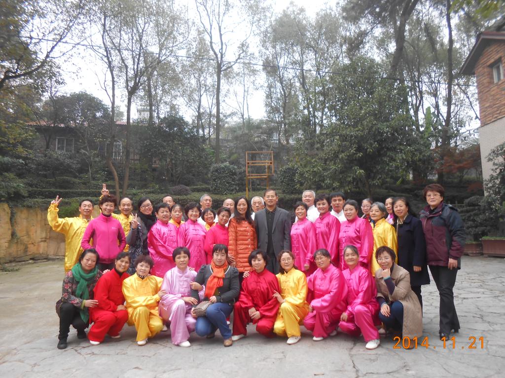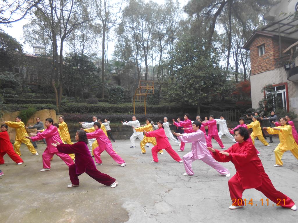 在简洁的开幕式后,老年大学的学员们身着靓丽的太极服装,表演了陈式太极拳24式、太极剑和养生操。表演者整齐的身姿和随风微动的太极服,在南山的半山腰间转身、踢腿、舒腰、舞剑,举手投足间,真可谓接天气之灵气,更让人体会到陶渊明“悠然见南山”的意境。