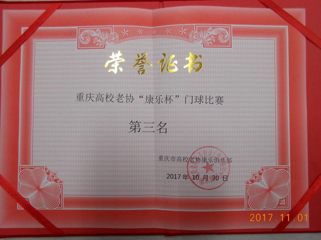 2017年10月30日,重庆市高校老协下半年康乐杯门球赛在重庆交通大学开赛,重庆市高校10个运动队参加比赛,我校门球队积极参加了这次比赛。我校门球队队员多数是在今年4月加入门球队,队员们团结合作,奋力拼搏,经过4场预赛,以小组第一名参加二场决赛,最后获得第三名。