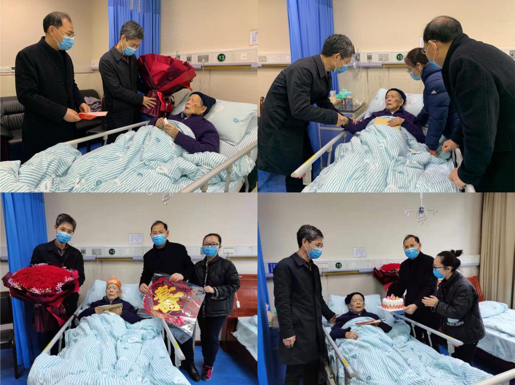 12月8日,校长孙芳城同离退休工作部的同志一起来到邓平老校长所在医院,为邓平老校长送上99岁生日祝福。