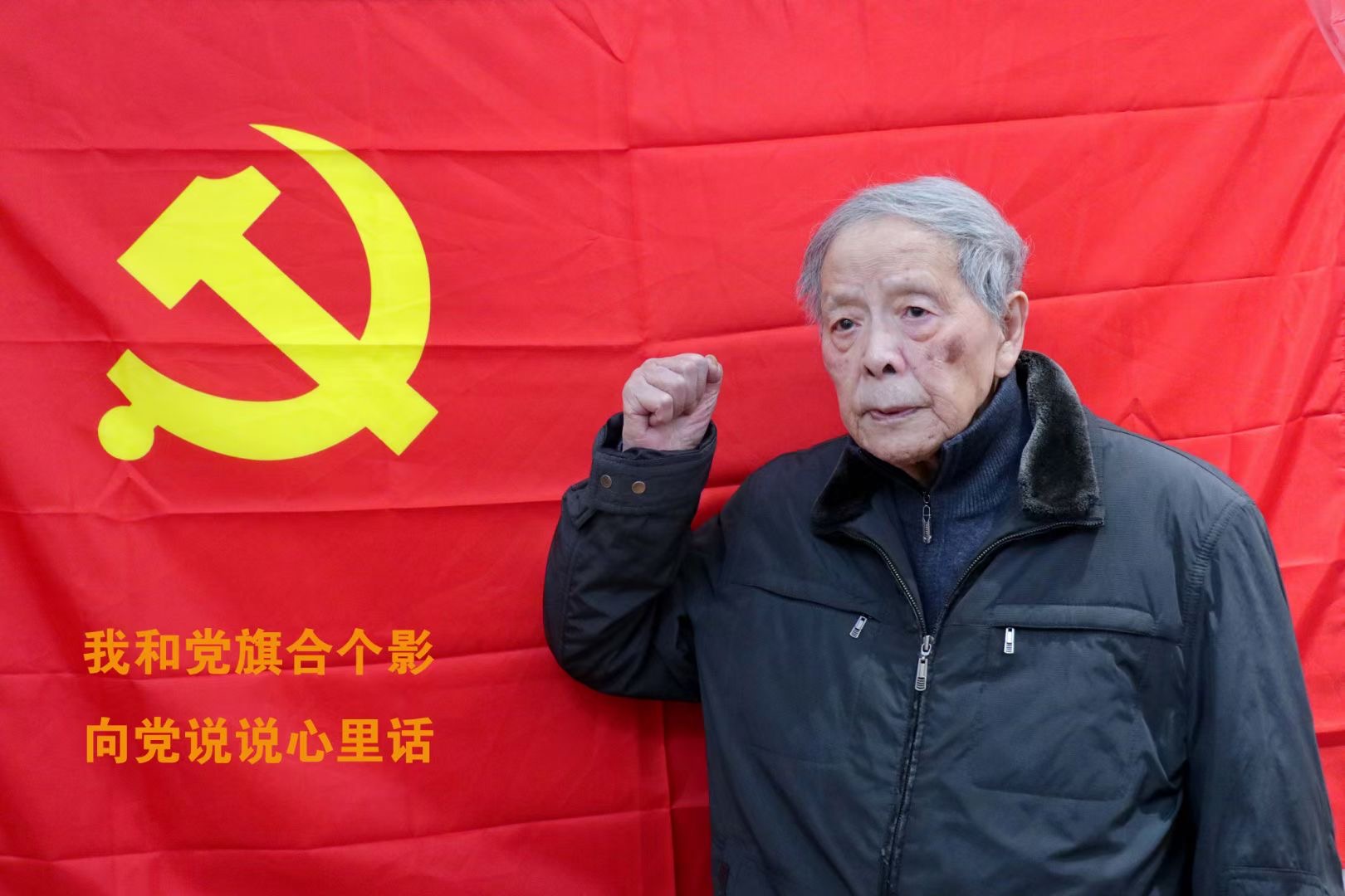 邓平,1921年出生于重庆,1939年入党并参加革命工作。当鲜艳的党旗挂在墙上,这位有着82年党龄的百岁老人缓缓起身,面对党旗紧握拳头,久久不愿离开。