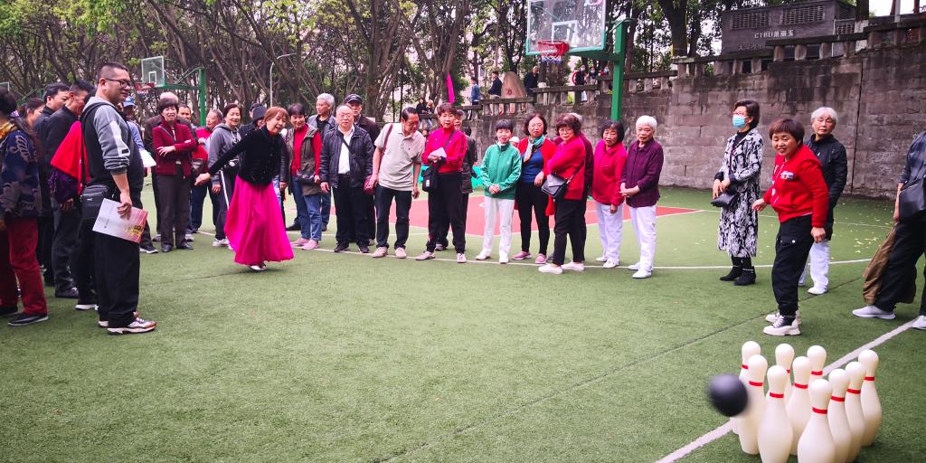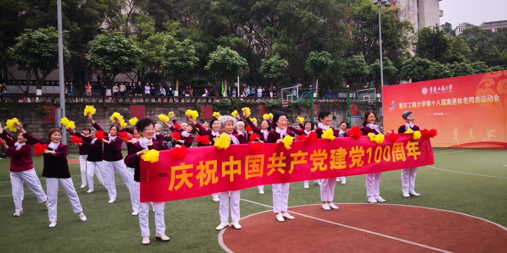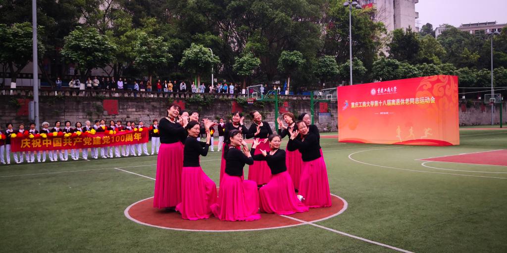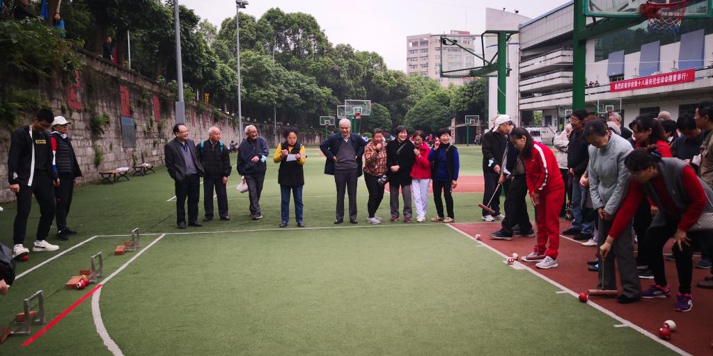 紧接着,进行了开幕式表演。江北校区老年大学的舞蹈《我和我的祖国》和南岸校区老年大学的舞蹈《绒花》先后登场。老年大学舞蹈队良好的精神状态,灿烂的笑容,矫健的身姿,感染着在场观众,活跃了现场气氛。开幕式后,开展了个人项目垒球掷准和篮球投篮,集体项目传球接力、保龄球和门球射门等运动。