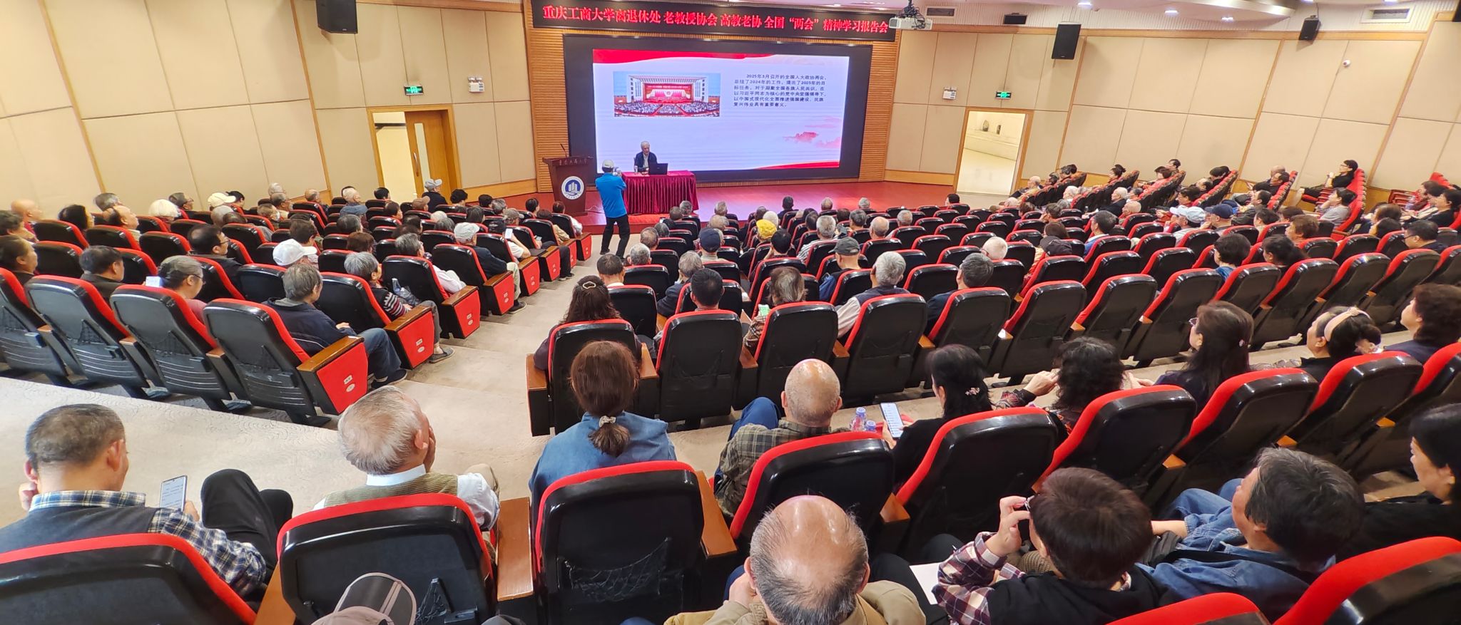 为深入学习习近平总书记在全国“两会”期间的重要讲话精神,由离退休党委主办,122cc太阳集成游戏老教授协会、高教老协122cc太阳集成游戏分会承办的全国“两会”精神学习报告会分别于4月14日和4月16日在南岸校区博智楼7200报告厅和江北校区图书馆报告厅举行。