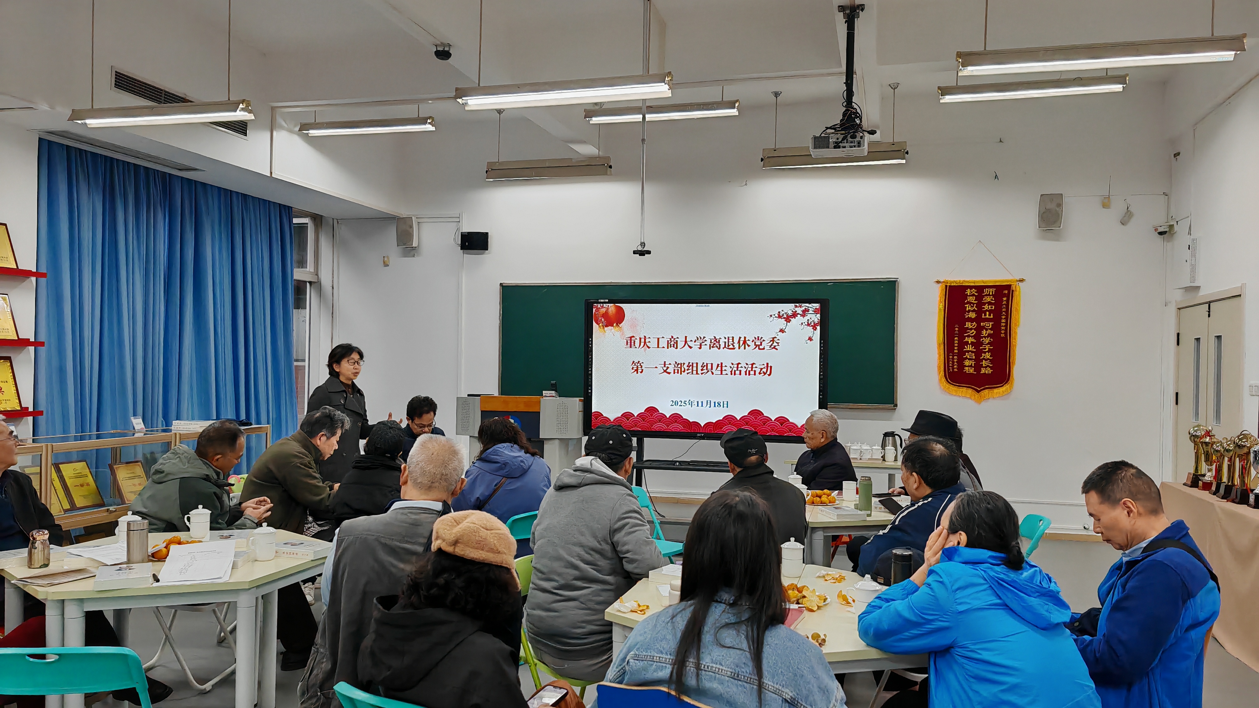 11 月 18 日,离退休第一党支部联合国际商学院教工党支部在国际商学院留学生展览室开展了学习贯彻党的二十届四中全会精神主题党日活动。活动由支部书记何玉霞同志主持,支部20多名党员参加。