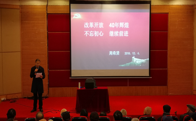 为纪念改革开放四十周年,2018年12月4日下午2:30,离退休工作部(处)组织老党员老同志在7200报告厅聆听原学校党委书记周希贤教授做题为《改革开放40年辉煌,不忘初心继续前进》的专题讲座。离退休党委书记、离退休工作部(处)处长赵承华、副处长陈南飞及离退休老党员老同志80余人参加。报告会由离退休党委书记赵承华主持。