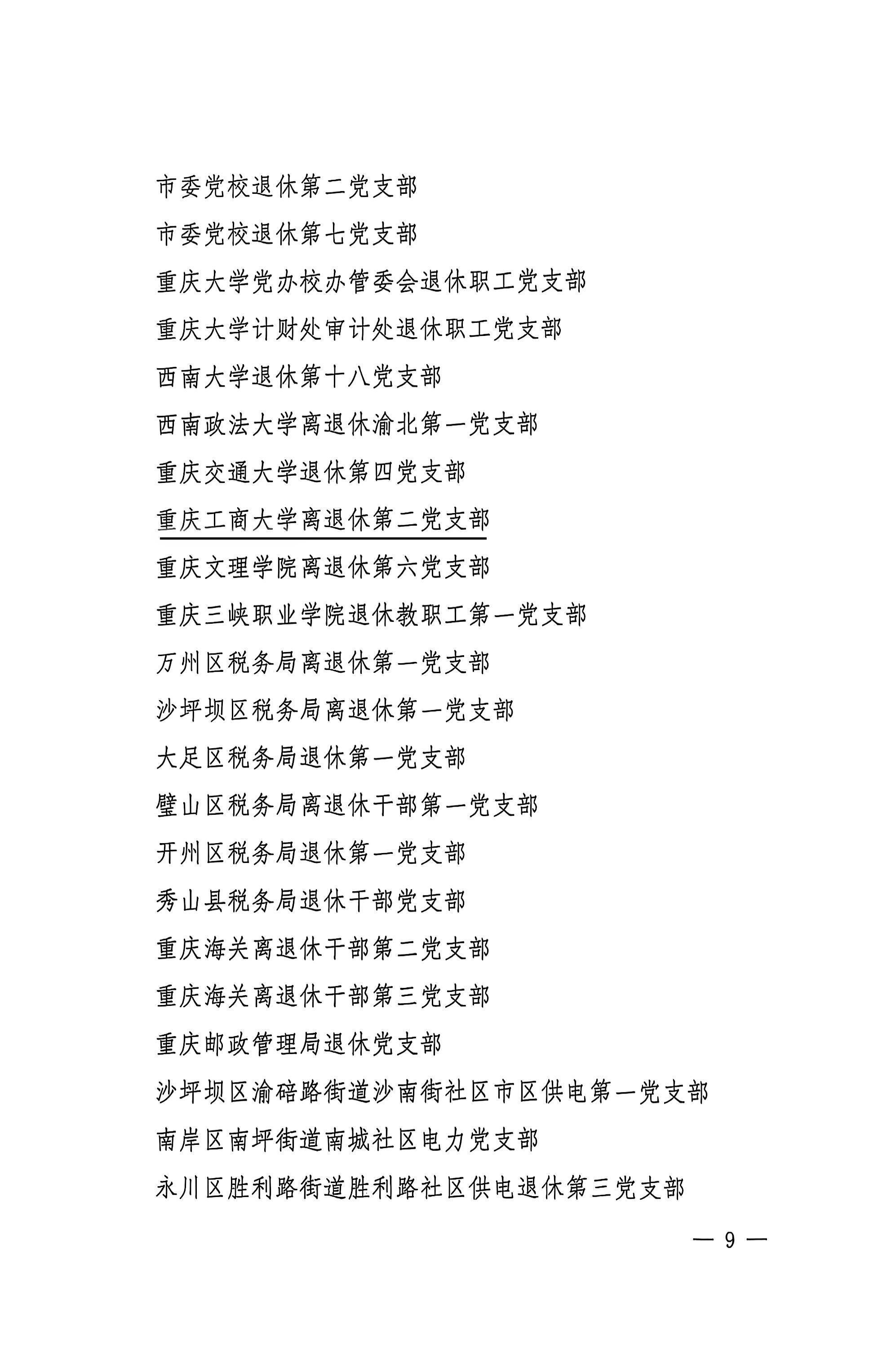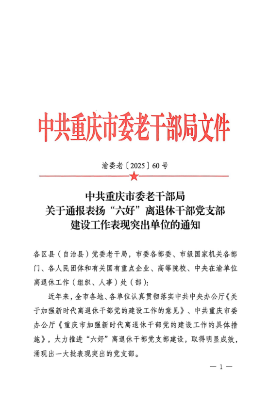 近日,中共重庆市委老干部局通报表扬“六好”离退休干部党支部建设工作表现突出单位,122cc太阳集成游戏离退休第二党支部光荣上榜。市委老干部局勉励受表扬单位珍惜荣誉、再接再厉,持续发挥示范引领作用。