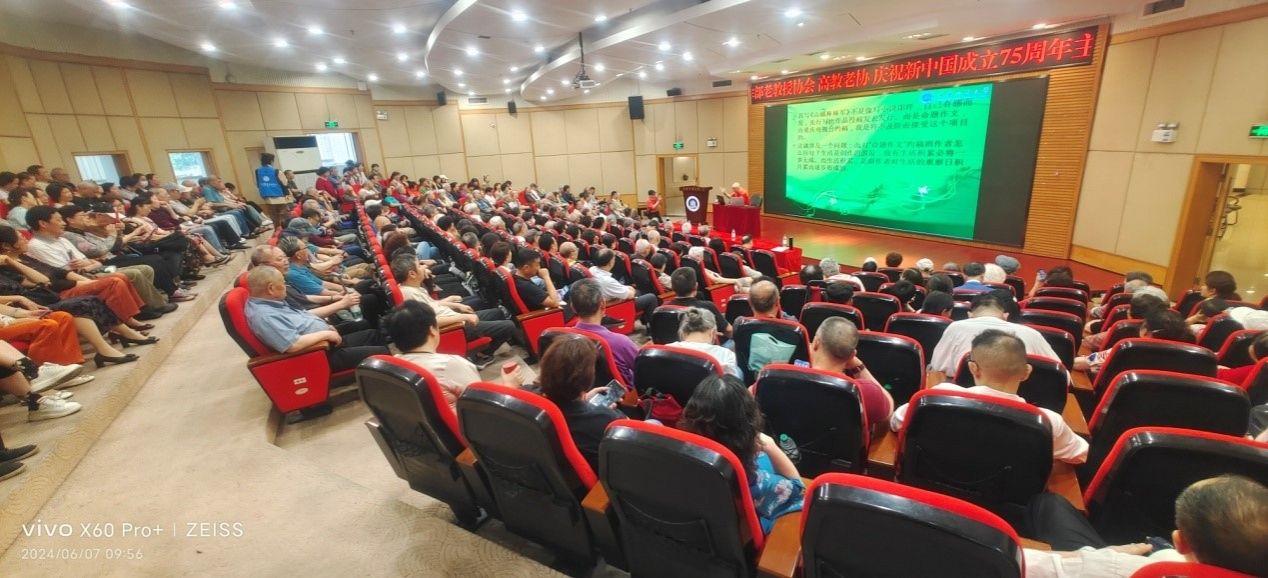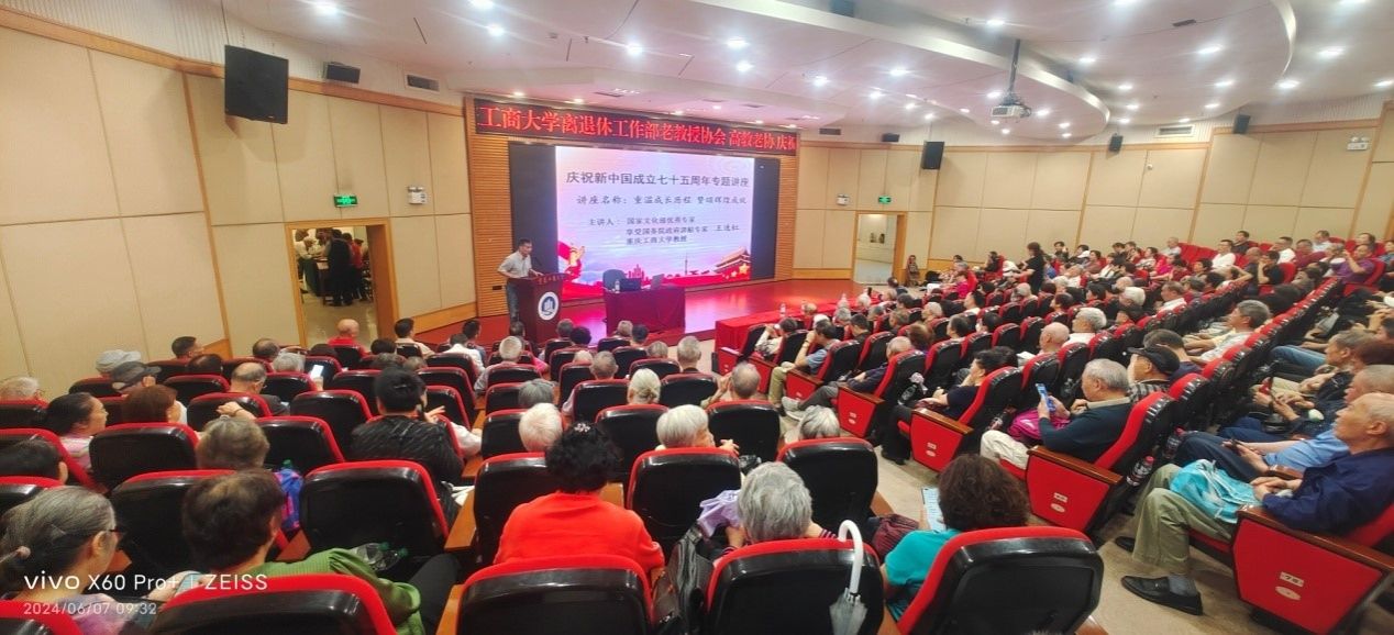 为庆祝中华人民共和国成立75周年,贯彻落实重庆市高教老协有关通知精神,6月7日上午,高教老协122cc太阳集成游戏分会联合学校老教授协会和离退休工作部(处),邀请重庆市高教老协第十一届理事、学校退休教师王逸虹教授举办了《重温成长历程,赞颂辉煌成就》专题讲座。讲座由高教老协122cc太阳集成游戏分会会长黄朗主持,300余名协会会员和离退休党委委员、支部书记等代表参加。